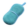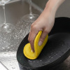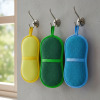 中央がくびれたピーナツフォルムは手にしっかりフィットし、握りやすい設計。二つ折りにしてフチを挟んで洗えるのも大きな特徴です。フックに掛けられるリボン付きで、乾かしやすいのもポイント。色ごとに使い分けもでき、食器や調理器具だけでなく、洗面台、浴槽、トイレなど、さまざまなシチュエーションで大活躍するマルチスポンジです。