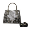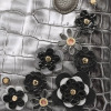 クロコダイル型押しとゼブラ柄の融合。 さらにフラワーモティーフとスタッズが大人の遊び心を演出します。