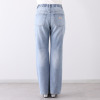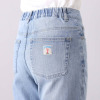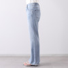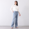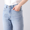 縦にうっすらと見えるスラブ感が脚長&美脚効果を演出。ヒップから膝にかけては程良いホールド感があり、裾に向かって広がるセミフレアーシルエットが美しいラインを描きます。ウエスト後部中心にゴムを配置し、締め付け感を軽減。手作業による擦り加工、加工を加えた金具など、本格的なデニム仕上げをほどこしています。