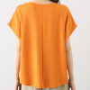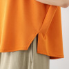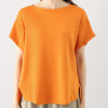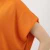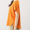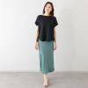 ボートネックをイメージしたやや横長のラウンドネックは、口布で上品に縁取りをして首周りをすっきりと演出。袖先を内側に折り返した逆三角形のシルエットが印象的。両脇のボリュームのある美しくゆるやかなドレープが、ボディーラインをさりげなくカバー。裾は前後差をつけたフェミニンな仕様で、裾両脇のスリットが着こなしのアクセントになります。