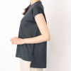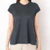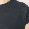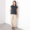 襟元はしっかりとしたダブル組織のクルーネックにしてきちんと感を演出。肩下がりのフレンチスリーブは二の腕をきれいに見せるよう計算されたパターンメイク。後ろ丈を長くして腰回りをさりげなくカバーできるように考慮しました。