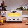 グラファイトヒータ(R)技術を採用し、素早く高温で焼き上げることで外はカリッと、中はもちっとした食感のおいしいトーストができる「グラファイト グリル&トースター」のご紹介です。大きめの庫内で食パンは4枚まで、22cmの大きめなピザを焼くことができます。忙しい朝にぴったりの実用性とおしゃれなデザインで大人気のグリル&トースターがさらに進化。焼き網が180度回転可能になり、焼き網を回転させて高さを変えることで、お好みの焼き方を選べます。また、下部ヒーターは石英管ヒーターを3本にし、食材をむらなく焼き上げます。グリルパン付きなのでトーストだけではなく、料理にも活躍。グリルパンはメーカー従来品より、容量をアップしたことで、よりさまざまな料理が楽しめるようになりました。藤井恵(ふじいめぐみ)氏監修のメーカーオリジナルレシピも付属しています。