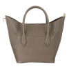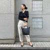 左右を折りたたんで金具で留めると、端正なボックスシルエットに変化し、かっちりとした印象を演出。金具を外して開放すると、軽やかなミニトートバッグとして使用でき、装いに合わせて雰囲気を切り替えられる仕様です。荷物が増えた際はトート形状で容量を確保でき、日常使いに十分な機能性を備えています。さらに、折りたたみ時に生じるラインをハギとして取り入れ、サイドのステッチをアクセントにすることで、どちらの形でも美しく見える仕上がりに整えています。