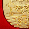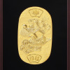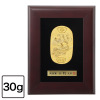 30グラムUPの純金を使用した小判“おしどりと花”です。寄り添うおしどりを中心に、菊と梅が織りなす華やかで愛らしい、吉祥文様とされる図柄を精巧にあしらいました。限られた空間(盤面)の細部に至るまで、日本の職人の超絶技巧が冴えわたり、純金ならではの山吹色の輝きと深みが存分に生かされています。独立行政法人造幣局の品位証明印(ホールマーク)である“造幣局検定マーク”付きで、確かな資産価値としての魅力も十分。額縁を付けてお届けします。