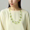 草木染めで丁寧に色付けしたグリーンカラーの琥珀(こはく)とプレーナイトをあしらった、ロングネックレスです。ボリューム感と奥行きのある立体的な表情が胸元を華やかに彩り、異なるフォルムが生み出す動きとリズムが装いに洗練された印象を添えます。
