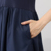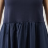 ワンピースは、上身頃に伸縮性のあるジャージー素材、スカート部分に布帛のサテン生地を使用。
